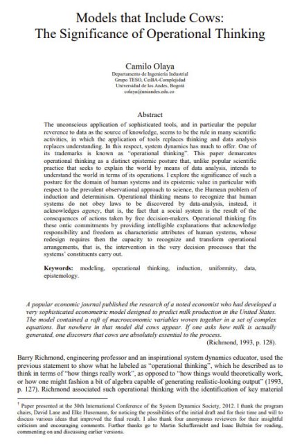 The unconscious application of sophisticated tools, and in particular the popular reverence to data as the source of knowledge, seems to be the rule in many scientific activities, in which the application of tools replaces thinking and data analysis replaces understanding. In this respect, system dynamics has much to offer. One of its trademarks is known as “operational thinking”. This paper demarcates operational thinking as a distinct epistemic posture that, unlike popular scientific practice that seeks to explain the world by means of data analysis, intends to understand the world in terms of its operations. I explore the significance of such a posture for the domain of human systems and its epistemic value in particular with respect to the prevalent observational approach to science, the Humean problem of induction and determinism. Operational thinking means to recognize that human systems do not obey laws to be discovered by data-analysis, instead, it acknowledges agency, that is, the fact that a social system is the result of the consequences of actions taken by free decision-makers. Operational thinking fits these ontic commitments by providing intelligible explanations that acknowledge responsibility and freedom as characteristic attributes of human systems, whose redesign requires then the capacity to recognize and transform operational arrangements, that is, the intervention in the very decision processes that the systems’ constituents carry out.