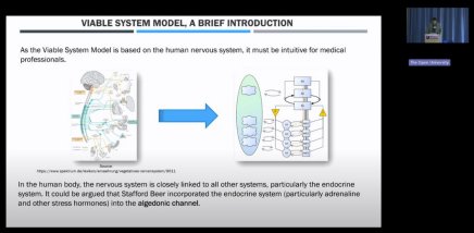 This presentation explores the Viable System Model (VSM) as a framework for integrating artificial intelligence (AI) applications in healthcare organizations. Drawing from clinical experience and healthcare risk management, the speaker emphasizes that every medical institution requires a coherent AI strategy aligned with its strengths and weaknesses. The VSM, developed by Stafford Beer, models organizations as adaptive systems composed of operational units and senior management functions, enabling analysis and optimization of complex structures. Using analogies to the human nervous system, the talk highlights how VSM clarifies roles of coordination, optimization, strategic adaptation, and normative management. Practical examples, such as emergency department workflows, illustrate how uncoordinated AI adoption can create systemic bottlenecks, while a top-down, VSM-guided approach can align AI deployment with organizational viability. The presentation reviews current AI use cases—diagnostics, triage, decision support, process optimization—and underscores the need for tailored, organization-wide AI strategies. It concludes that VSM offers a robust methodology to ensure that AI strengthens healthcare delivery, mitigates systemic dysfunctions, and supports the transition toward AI-powered healthcare organizations.